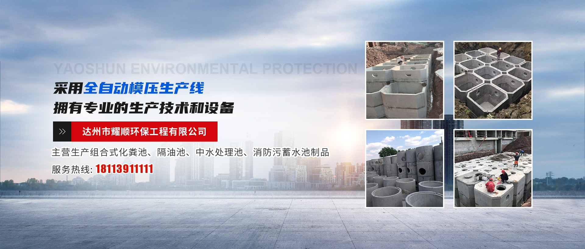達州市耀順環保工程有限公司位于四川東北部、達州市中部通川區。本公司采用全自動模壓生產線,擁有專業的生產技術和設備,同時擁有一支專業的施工隊伍。本公司堅持質量第一、互惠發展,讓您的居住環境更美、更舒適,是我們工人的宗旨。本公司愿與廣大建筑同仁一道,為美化城市作出貢獻。我公司現生產組合式化糞池、隔油池、中水處理池、消防污蓄水池制品。我們的產品在建筑工程中不斷接受檢驗,具有安裝便捷、施工安全、用時短、結構合理、堅固耐用、抗滲性能好、凈化效果明顯、經濟合理的優特點。...